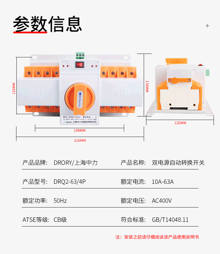 DRQ2-63/4P 10A~63A双电源自动转换开关系列