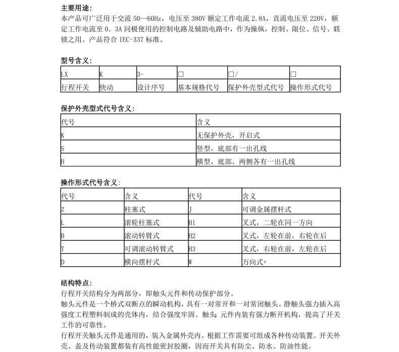LXK3-20S/T,D,B,J,W,L,Z,H1,H2,H3系列行程开关