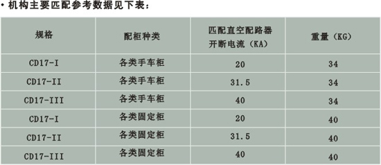 CD17及CD17A 型直流电磁操动机构专供操动ZN28—10型系列户内高压真空断路器及其他操作频繁的真空断路器之用。Cd17型电操机构用来操动各类手车柜上之户内高压真空断路器,CD17A型电操机构用来操动各类固定柜上之户内高压真空断路器,该系列电操机构使用直流电源,配户内真空断路器进行电动合分、手动分闸、遥控分闸及自动重合闸操作,其性能完全符合其技术条件之要求,由于本产品的安装孔位与CD10型电操机构一样,故特别适用于老开关柜的无油化改造,本产品的机械寿命为10000次。