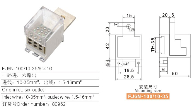 FJ6G-100/10-35/2×25开关端子(一路进,二路出)